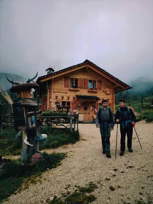 The first time you walk at night you cling to your flashlight, as if it were a weapon that can protect you from the dangers of the dark. Little by little, with experience, you realize that the Moon is your best ally, and you discover the incredible ability of your eyes to adapt to darkness. We walked surrounded by fog with just a few meters of visibility for several hours, cows appeared to us sleeping in the middle of the road, everything seemed worthy of a scene from the Lord of the Rings. At around 9 in the morning we found a refuge, Malga Rossalm, we decided to go in to shelter from the cold and have lunch. When we entered there was only one boy, about 12 years old, endearing, blond and chubby, who invited us to enter when he saw our stupefied faces and prepared us some coffees and some scrambled eggs with ham, which tasted like glory. Without a doubt, a stop left its mark.