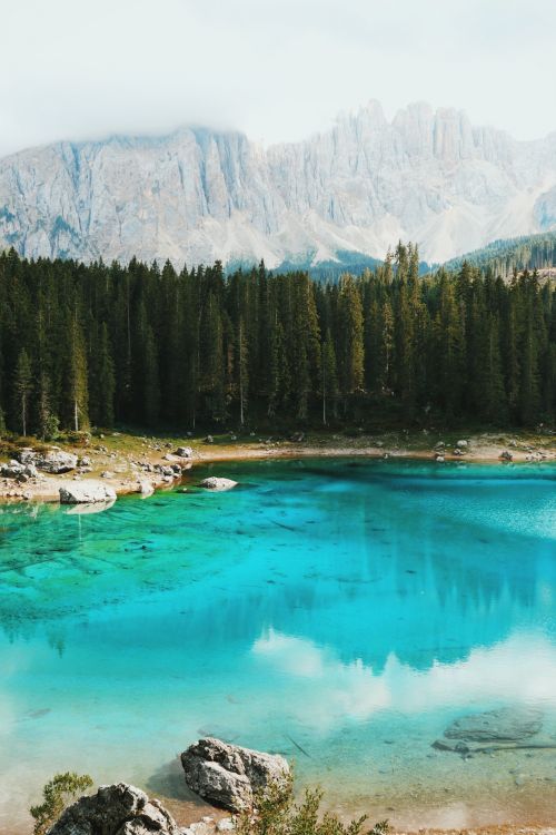 We continued north, the landscape was changing, the mountains began to surround us, we crossed a large river by a bridge, we crossed a mountain range through a tunnel and soon after we reached Lago Di Carezza. Perhaps a not so popular postcard from the Dolomites, a postcard that welcomed the Italian Alps, a postcard made up of three layers: a lake of mesmerizing colors, a horizon of pines and firs, and in the background, a mountain range with endless of peaks.